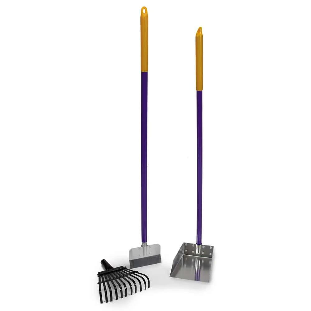 Clean up is fast and easy with the versatile Boss Pet Dog 3 piece Waste Pick Up Combo Set. Eliminate bending and stooping with long handled tools. Quickly change from spade and rake with one button. Locks handle firmly in place. Durable and lightweight, with rubberized handles, made to last. Wooden Handles, sturdy aluminum rakes, spade, and scoops. Rake is perfect for scooping waste out of grass, and switch to spade for hard surfaces. Easy to clean with a quick spray from your hose. Detachable design is easy to assemble and disassemble to save space, hangs with the eyelet on handles for storage.