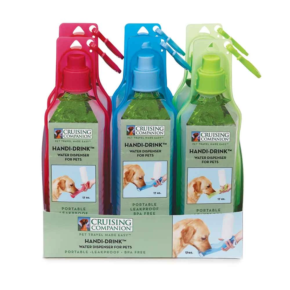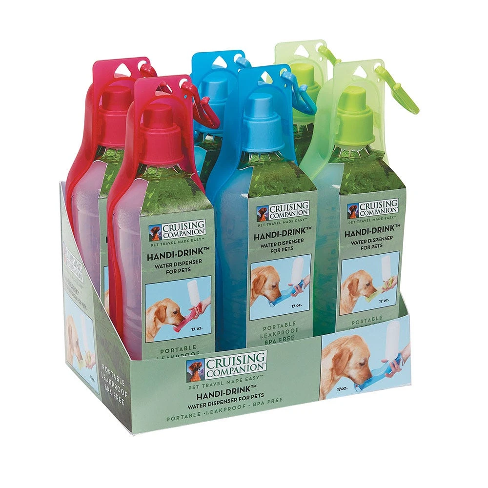 Cruising Companion® Handi-Drinks keep pets hydrated on the go while preventing leaks, spills, and backwash contamination! The perfect way to give pets fresh water while traveling. Handi-Drink Mini keeps smaller pets supplied with fresh water on the go. Ideal for walks, hikes, car rides, camping, and trips to the beach. Leak-proof water bottle features an attached drinking tray that folds up for easy storage. Includes a belt clip and carrying strap. Fully stocked Displays of each size come with six; two of each color.