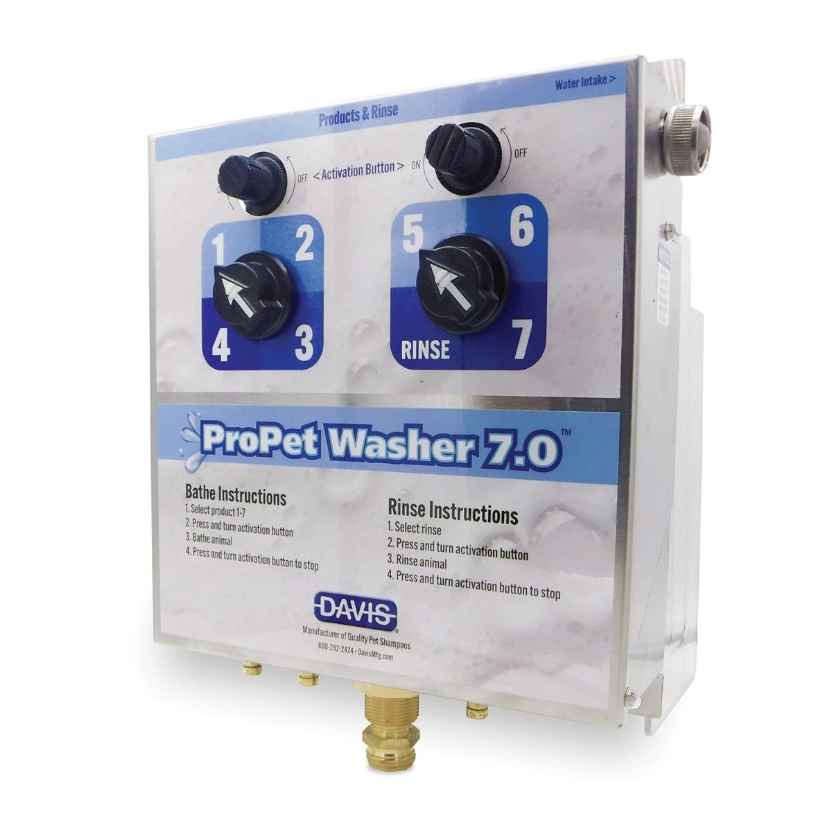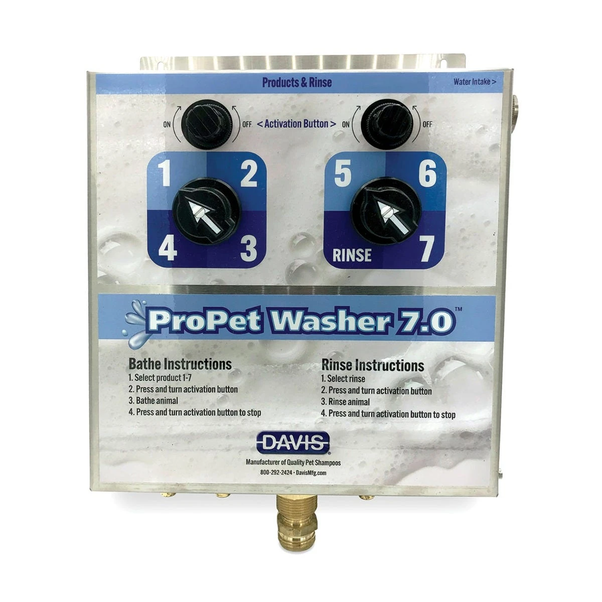 New and improved Davis ProPet Washer 7.0 System helps give a better bath and saves time. Eliminates the need to pre-dilute products, simply insert the included plastic tubes into your shampoo or conditioner. Works off of your existing water pressure. The unique quick-connect nozzle attachment creates one of the strongest water flows available to clean deep into the coat and skin. Constructed of durable stainless steel, you can connect up to four bottles of shampoo or conditioner at a time.