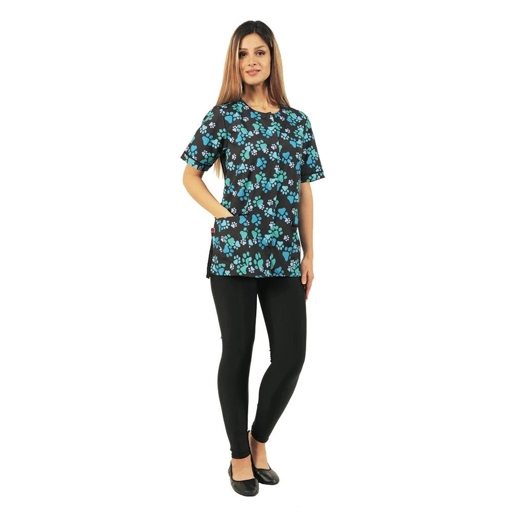 Look great and stay dry in the LadyBird Line Waterproof Paw Print Jacket. Waterproof, hair repellent, bleach resistant, chemical proof material. Added front zipper cover panel ensures you stay dry during the bathing process and helps protect from rubbing against tubs and grooming tables. Solid black back. The covered lapels over the pockets helps to keep debris and water out and prevents the pockets from tearing. With both fashion and function all in one, you will look great doing what you love.