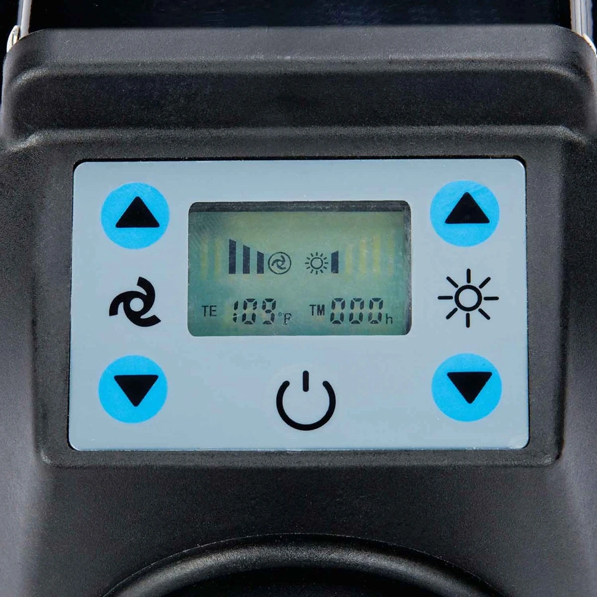 - User-friendly buttons surround an LCD screen that displays everything from the air output setting to the heat level