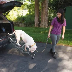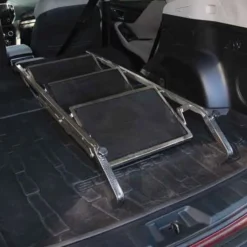 Sturdy, rust-resistant, chrome-plated steel Master Equipment® Pet Stairs for Dog Grooming Tables, Tubs, and SUVs eliminate the need to lift heavy pets onto tables, into tubs, and SUVs. Folds flat for easy storage and transport. Grooved, PVC rubber mat covered steps give pets a sure footing and prevent pets from slipping. Great for salons, mobile groomers, and travel. Includes removable extension hooks for a secure adjustable grip and stability. Holds pets up to 150 lbs.