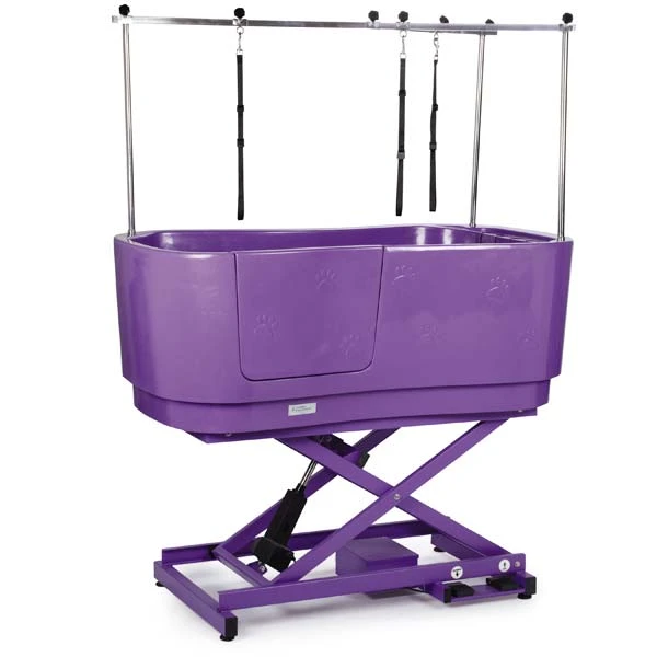 Tub boasts a fashionable pop-up pawprint design on the front and bottom of the basin to prevent slippage. Removable door lifts straight up for easy entry and exit — a great back saver.