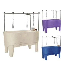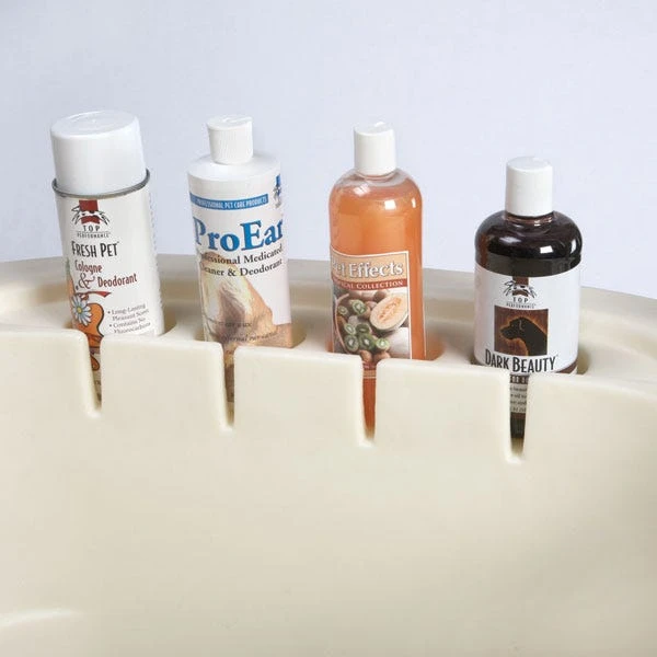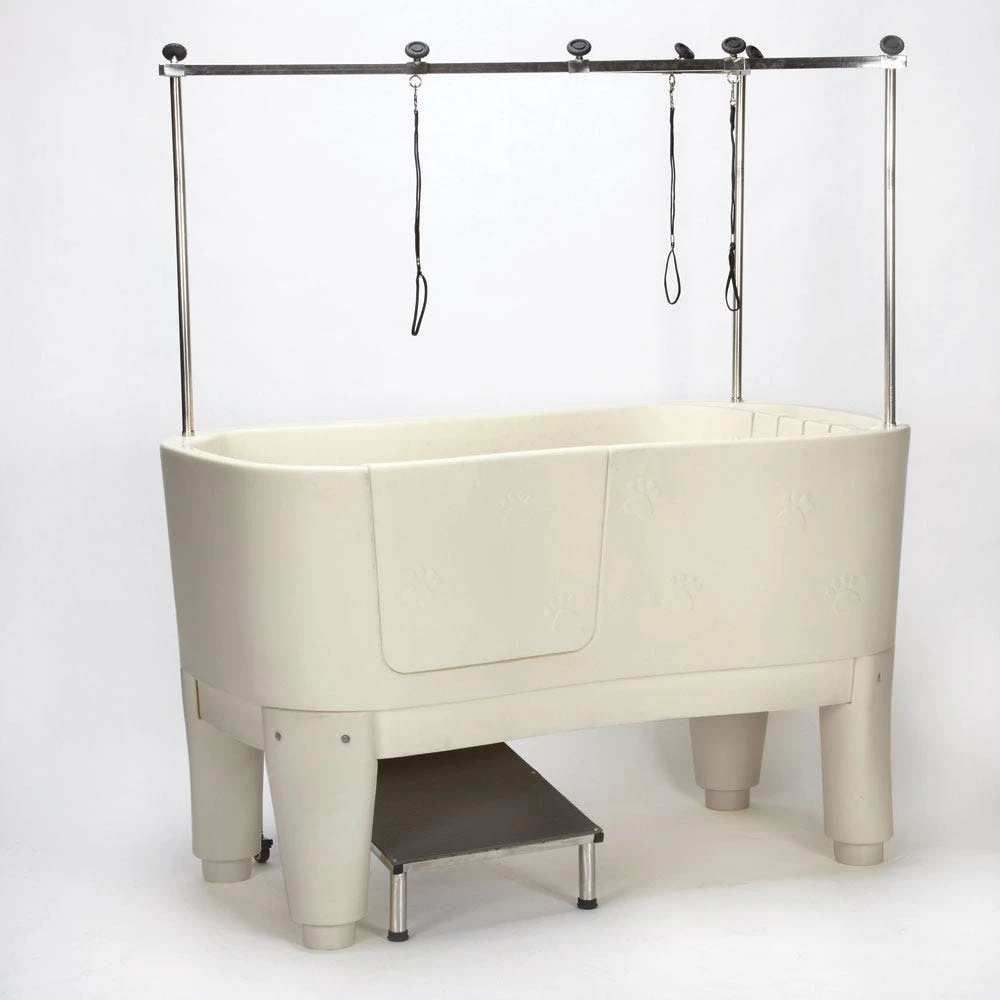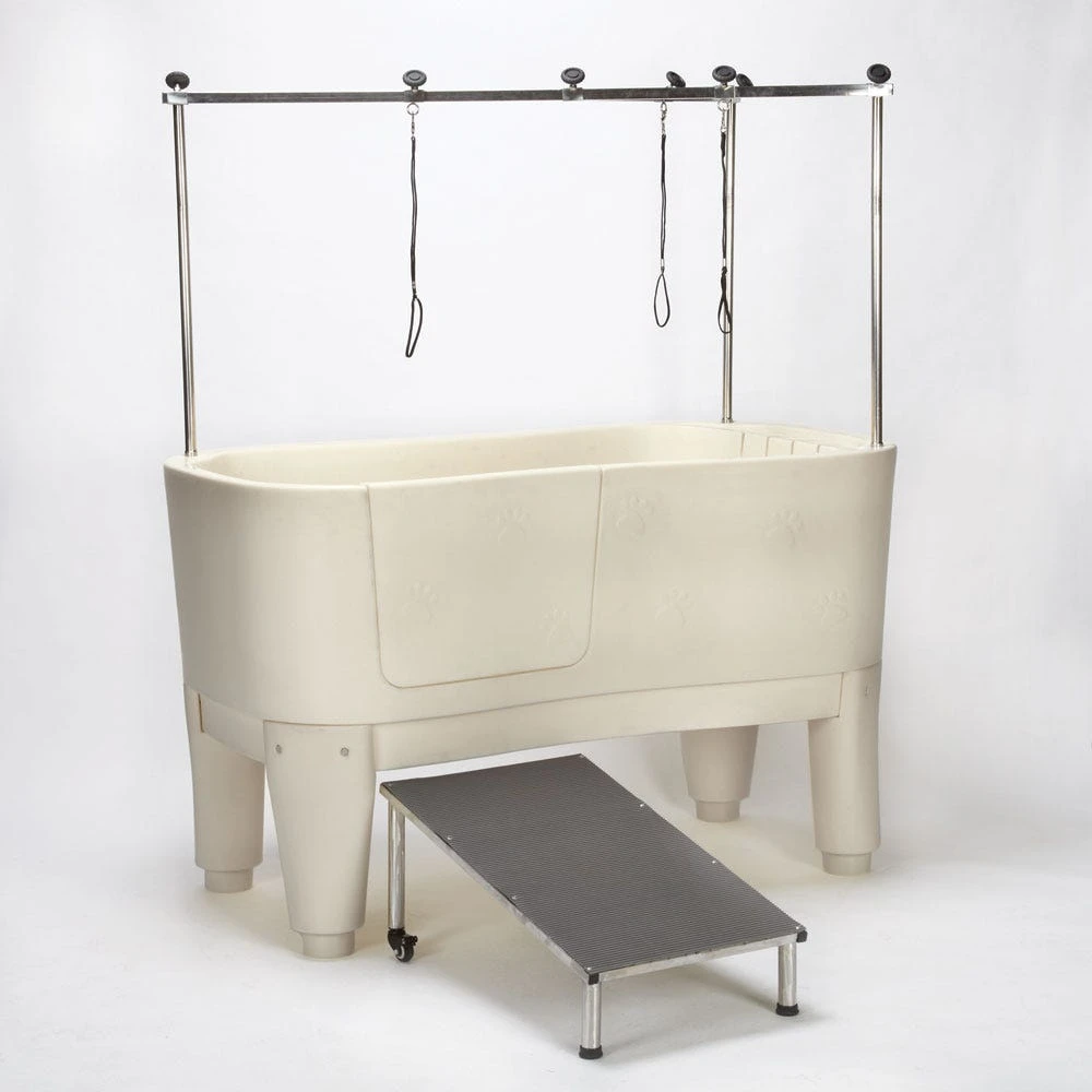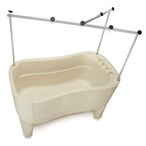 Includes a shampoo bottle holder, an overhead grooming arm, two grooming loops, and a raised tub rack for grooming small dogs. The raised pawprint design adds a fashionable touch to the front of the tub and prevents pets from slipping inside the basin.