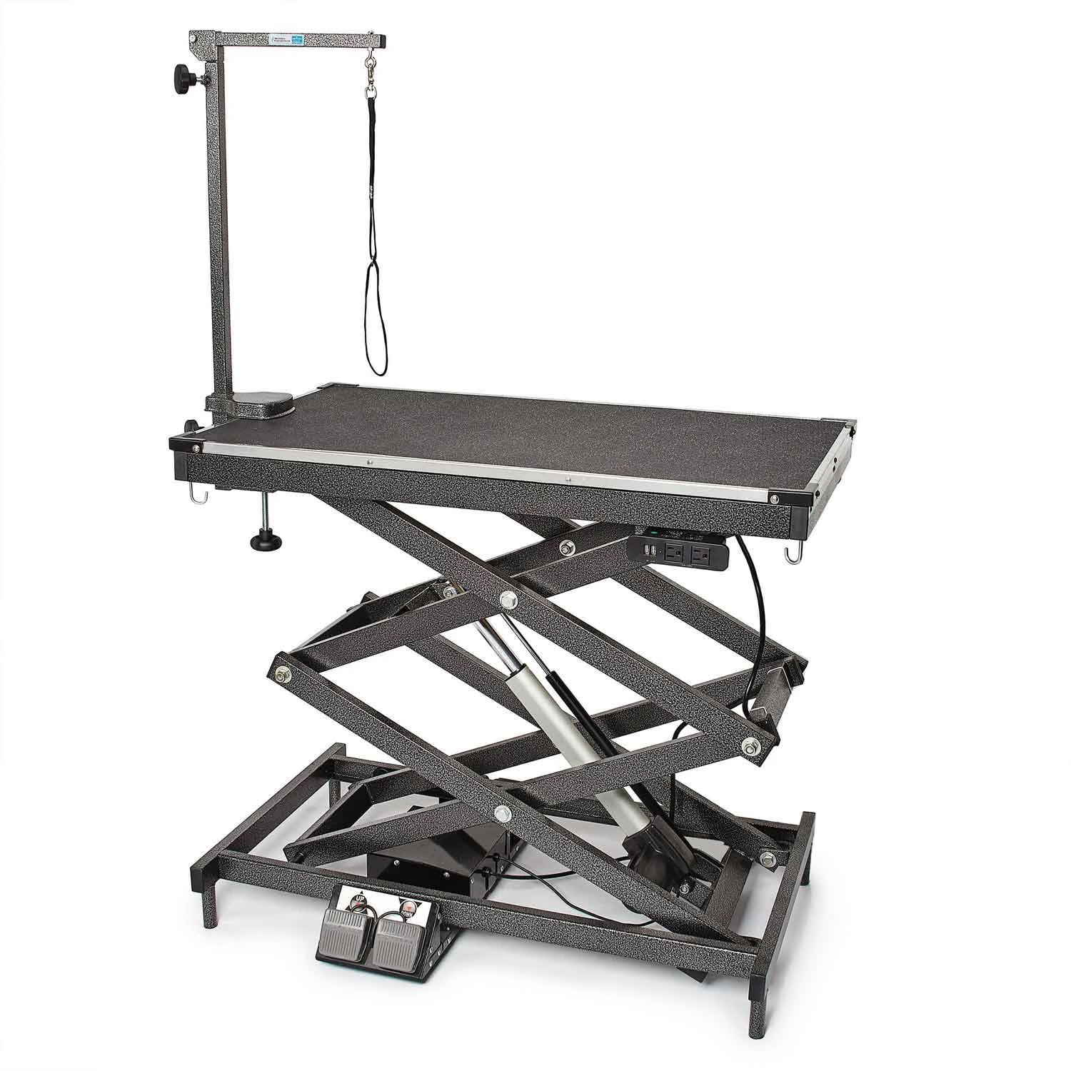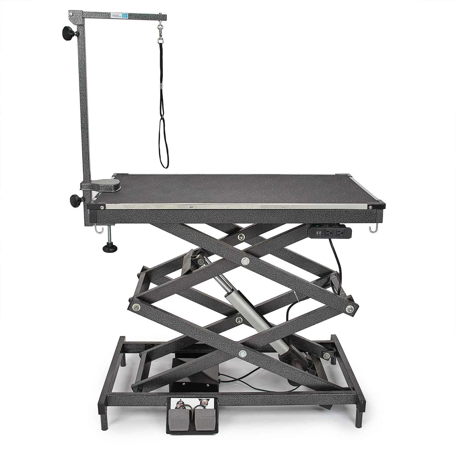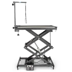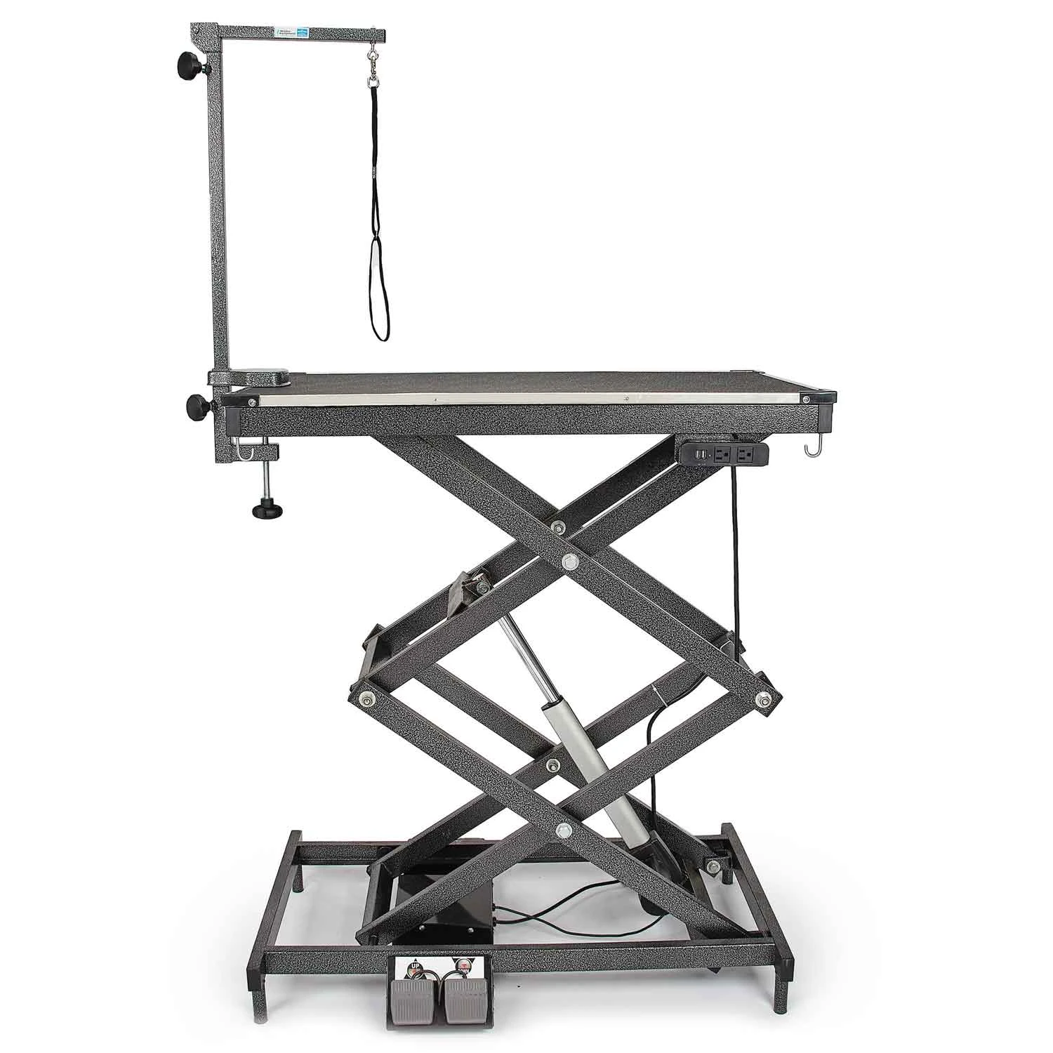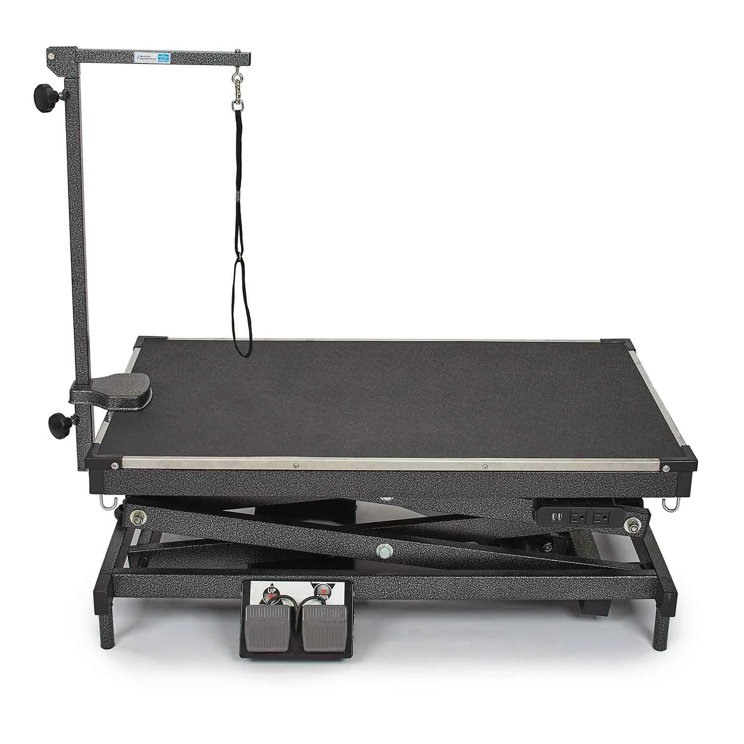 Master Equipment® X-Tend Delux Electric Grooming Table is a professional-duty versatile table designed for the professional groomer. Powerful lift capacity of 220 lbs means this table can handle the big dogs! Table height is adjustable from 11″ (without Grooming arm attached, 21″ with Arm attached) to 48.5″ eliminating the need to pick up large dogs and the max height means you can groom the little dogs at a comfortable height. Two USB outlets for charging or USB tools and two electrical outlets for corded clippers and dryers keep the floors clear and safe around the table. Convenient hooks for hanging tools so you can keep your table top clear. Levelers on all four legs keep table steady on uneven floors. Convenient dual foot pedal control to raise and lower the table. 41″ x 24″ top. Includes Grooming arm with clamp and Grooming loop.