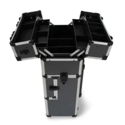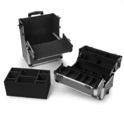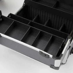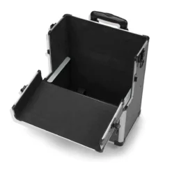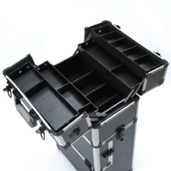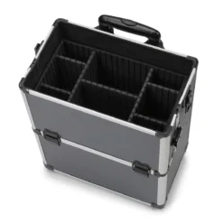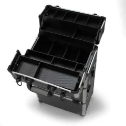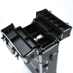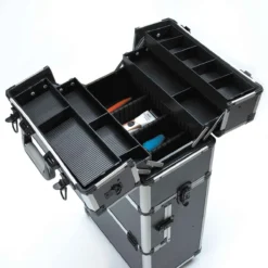 Newly-designed Master Grooming Tools Travel Storage Case organizes and protects your valuable tools equipment and other valuables during travel and transport. Beautifully designed case is solid and durable and offers plenty of customizable storage. Perfect for mobile groomers, competitions, travel, salon and personal use too. Made of high-quality materials, with solid aluminum frame, reinforced corners, telescoping handle, durable hardware and wheels. Locking clasps for security. Removable top section has wide opening with organizer trays and handle and strap for convenience. Large removable inside compartment is great for bottles, clippers, and grooming aids and has customizable sections. Additional deep storage at bottom of case offers space for larger items.