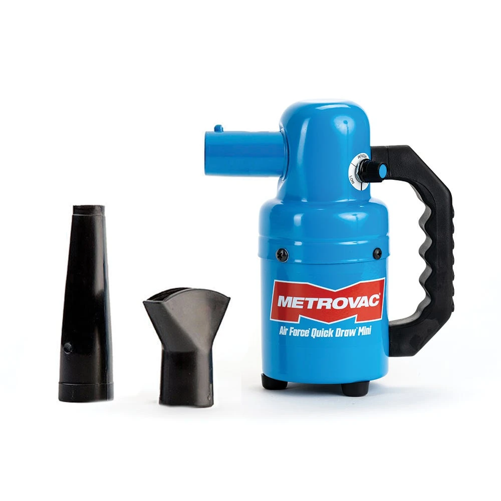 The MetroVac Air Force® Quick Draw® Mini is a lightweight and portable variable speed grooming dryer that’s compact yet powerful. With 500 watts and .75 peak hp, it produces 5 times more blowing power than a human hairdryer and gives this dryer the ability to dry even the largest, long-haired dog in minutes. Features warm air generated by the friction of the motor creating “gentle heat” (approximately 25-30 degrees above ambient), making it safer than a human hair dryer. Will not dry out their coats or burn their skin. Its light yet durable all steel construction will last through years of grooming sessions. It comes with 12 ft grounded cord, grooming tools including an air-flare and air concentrator blower nozzle.