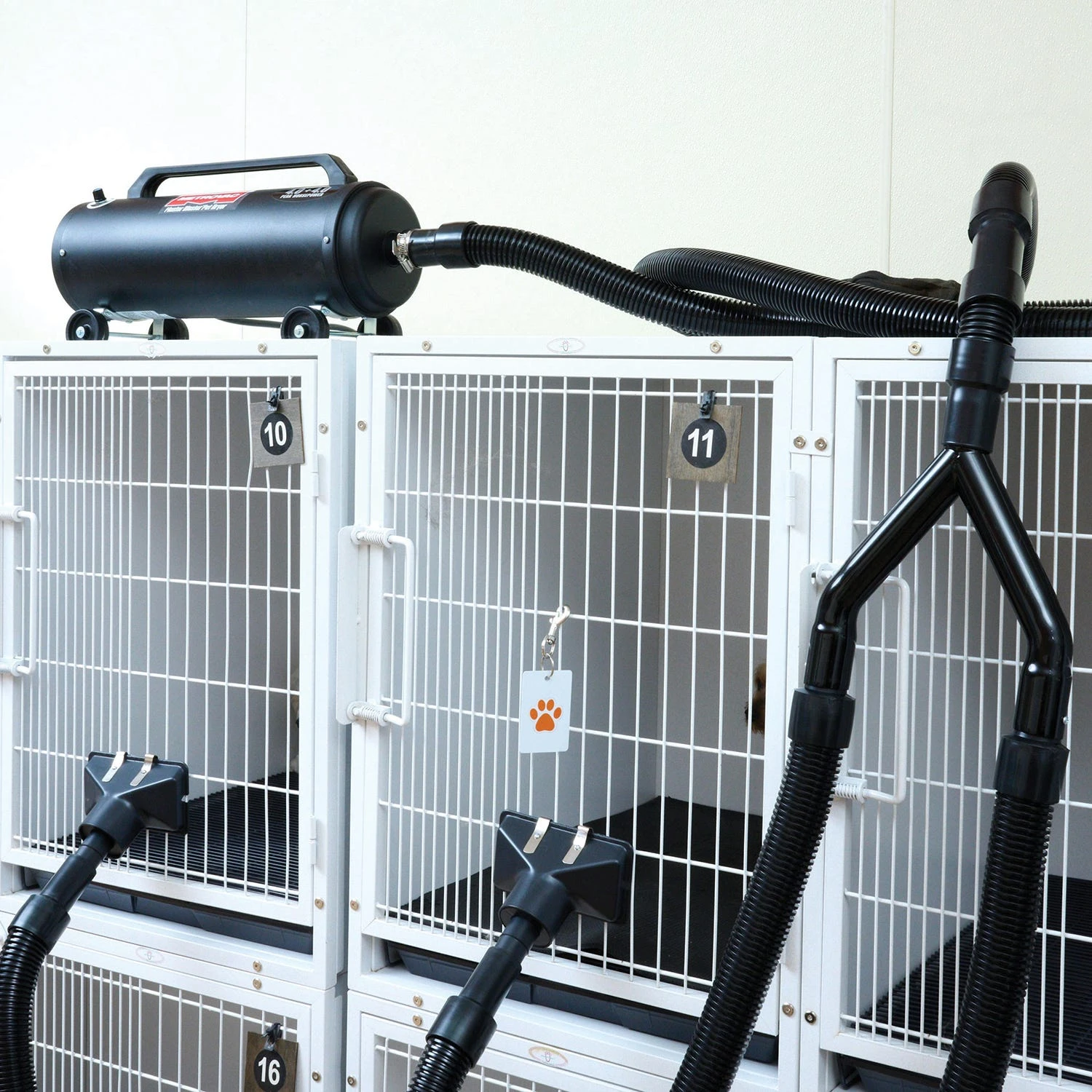 Now you easily can convert your MetroVac Master Blaster or Air Force Twin Turbo dryer to a double cage dryer with Metro® Dual Cage Dryer Kit. Simple kit attached to your dryer allows you to safely dry two dogs at the same time without the dangerous heat that is associated with some cage dryers.