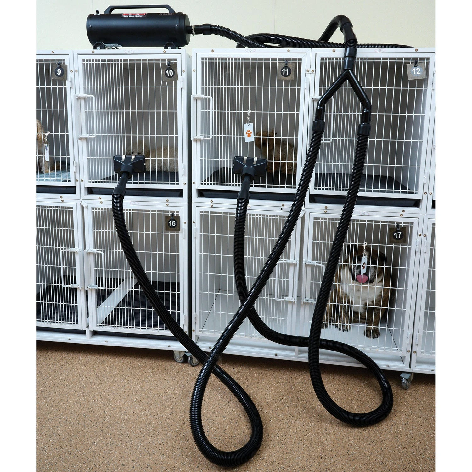 The dual cage dryer kit includes the steel Y shaped tube with high gloss black powder coat finish, two 10-foot hoses which can be cut to desired length and two cage dryer attachments.
