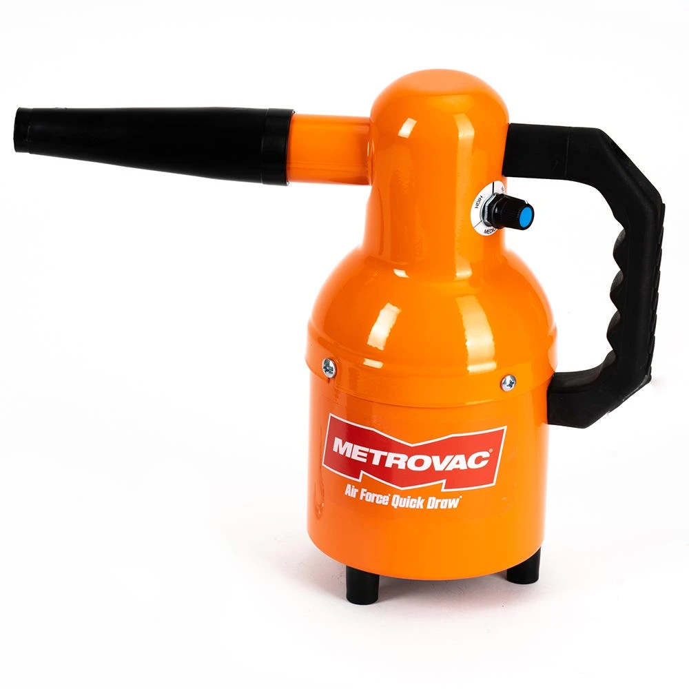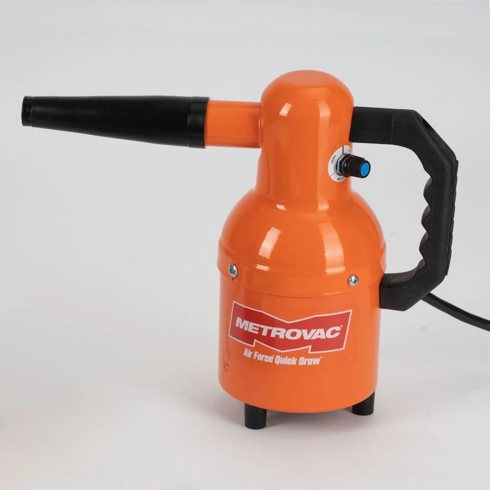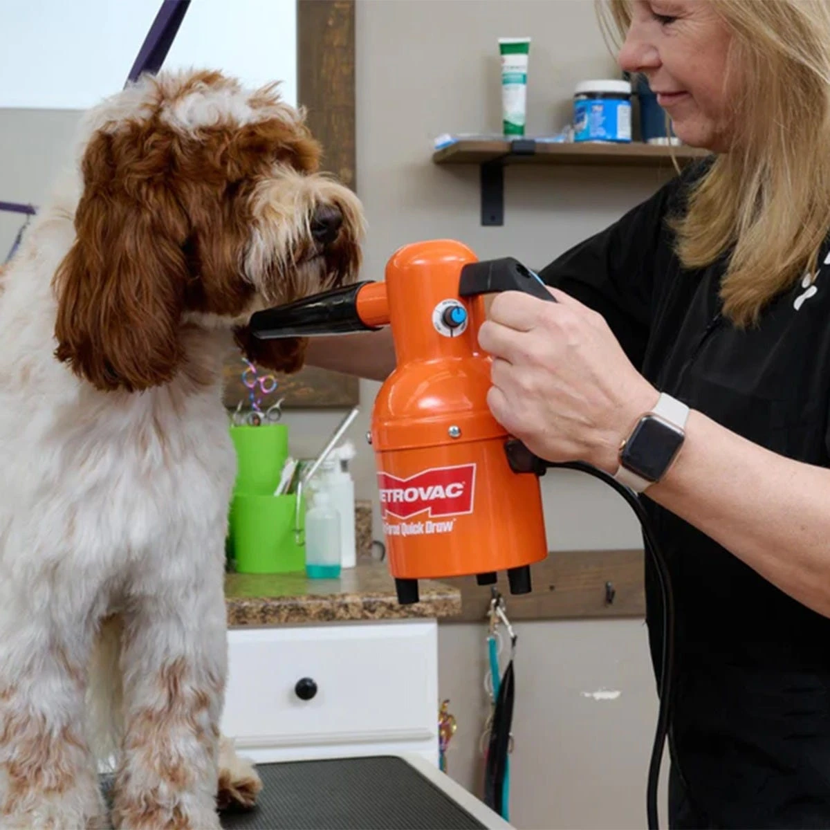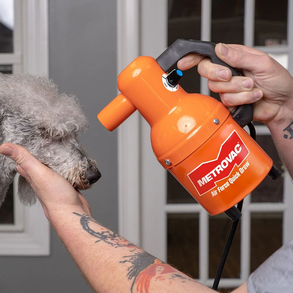 The Metro® Air Force® Quickdraw Variable Speed Dryer produces 10 times more blowing power than a human hair dryer yet is safe for all pets because there’s no heating element to dry out their coats or burn their skin. Variable Speed Control is perfect for pets sensitive to noise levels. It makes drying and grooming effortless with its portable, lightweight frame and powerful 1.3 HP motor. With all steel construction, this reliable dryer is built to withstand years of use. Includes 6 ft. hose, 12 ft. power cord, air concentrator blower, air-flare, table mounting hook and a shoulder strap for easy carrying and mobility. Made in USA