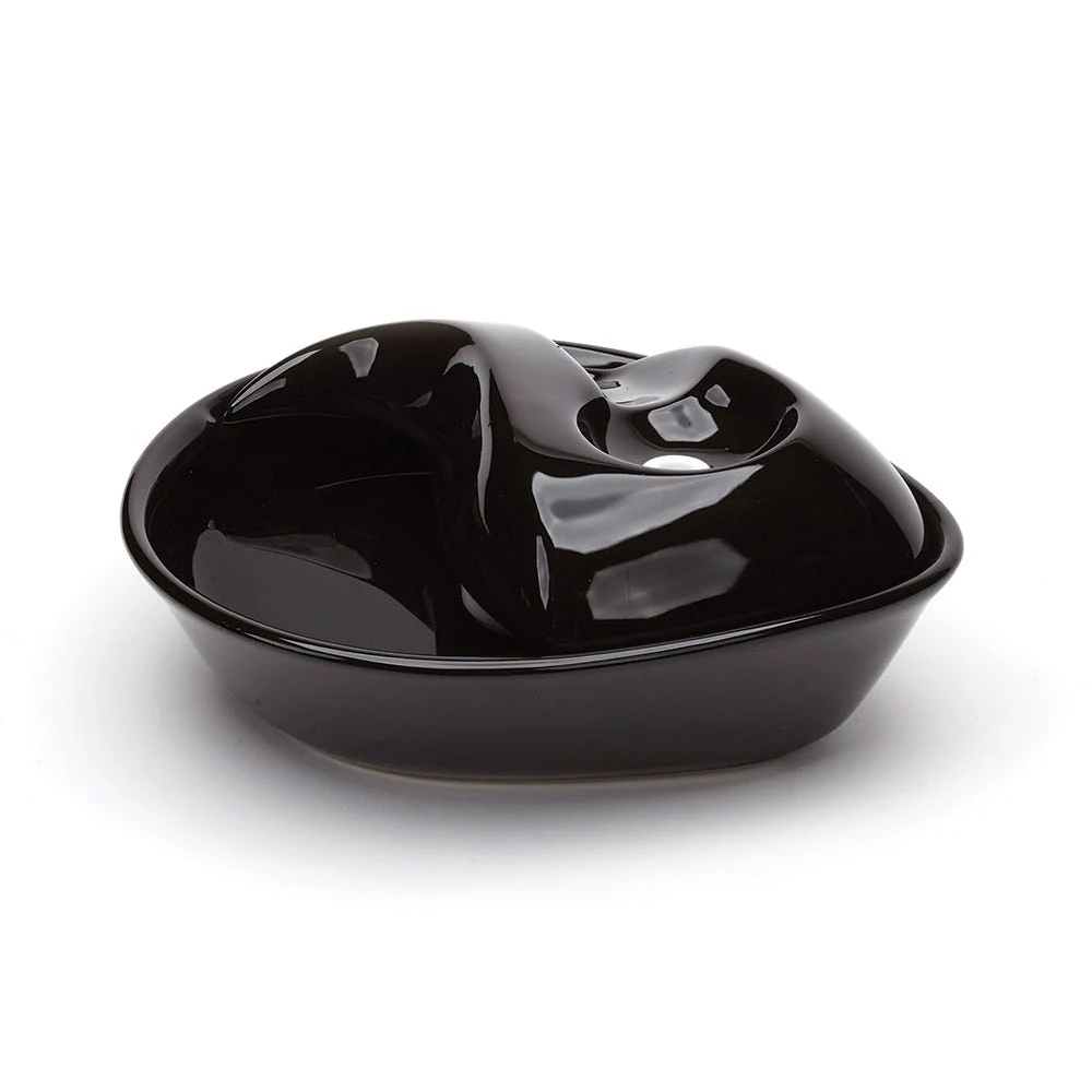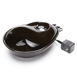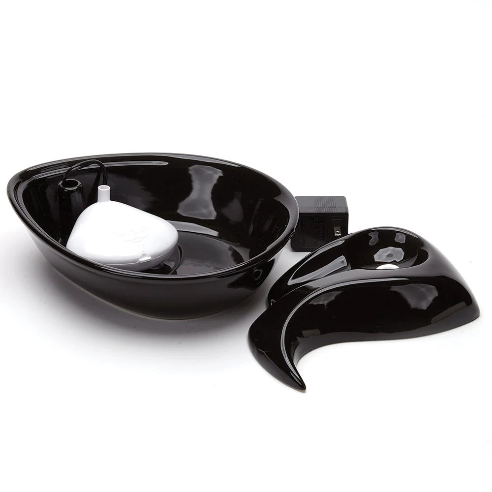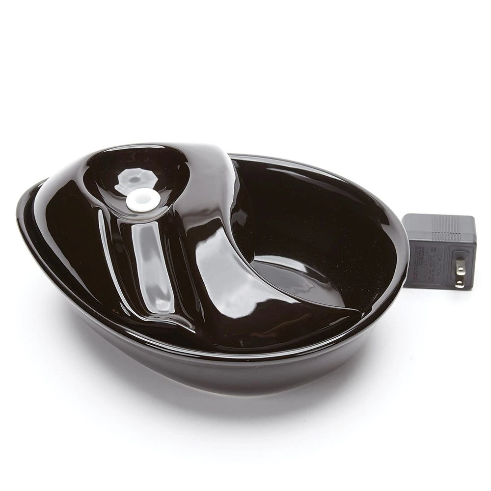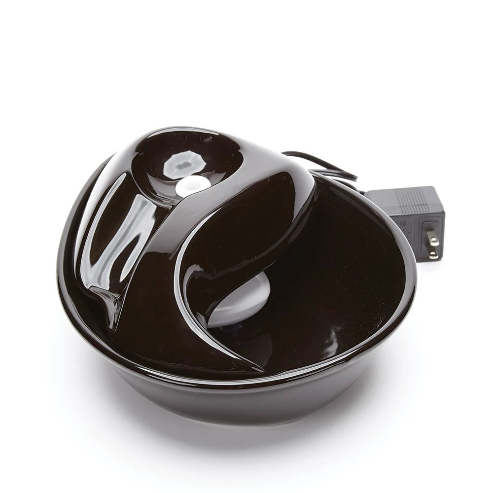 Circulating drinking water is naturally appealing to pets, and encourages them to drink, promoting better hydration and health. The Pioneer Pet Raindrop Black Ceramic Fountain drinking bowls feature a replaceable charcoal filter with three layers of filtration to capture debris and remove unnatural tastes and odors from tap water. Made of heavy-duty ceramic – ceramic drinking bowls help prevent feline acne, easy clean and dishwasher safe. 60 oz capacity reduces the number of daily refills. Continuously filters water. Modern raindrop shape.