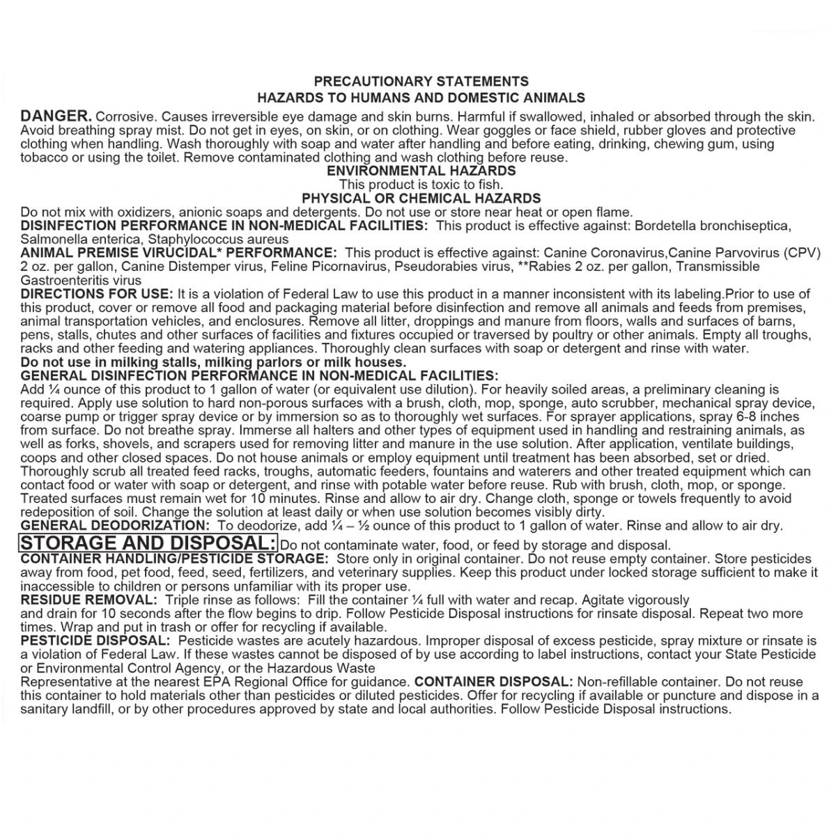 Directions For Use: It is a violation of Federal Law to use this product in a manner inconsistent with its labeling. Recommended for use in veterinary clinics, animal life science laboratories, tack shops, pet shops, kennels, grooming establishments, breeding establishments, hospitals, colleges, commercial and industrial institutions, office buildings, hotels, motels. Disinfects, cleans, and deodorizes the following hard, non-porous, inanimate surfaces: floors, walls, cages, runs, etc. Safe to use on Synthetic Turf.