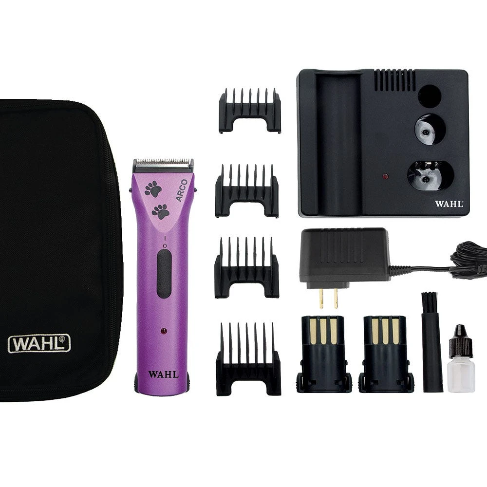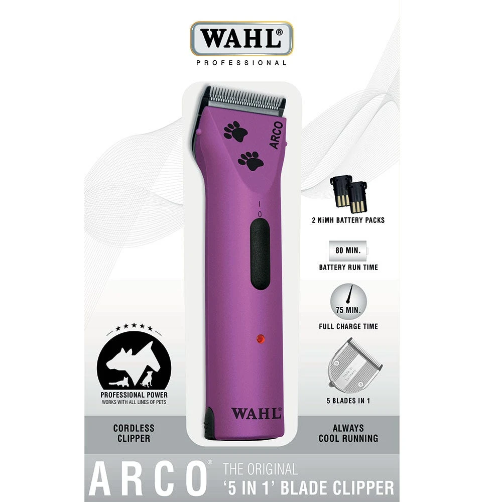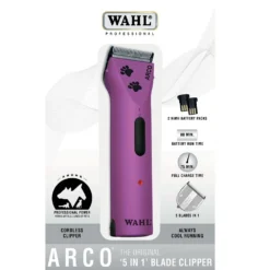 The original 5-in-1 clipper, the Wahl Arco is the tried and true cordless option for precise trimming in hard-to-reach spots such as ears, faces, and paws. The Arco is powerful enough to shave down small dog breeds and quiet enough to clip bridle paths and fetlocks on horses. The Arco kit comes with 2 removable batteries that each have a run time of 80 minutes. With a 75-minute full charge time, keep one battery on the charger and the other in the clipper to ensure continuous all-day clipping. Featuring Wahl’s signature 5-in-1 Blade, enjoy the convenience of having five blade sizes in one easy-to-adjust blade